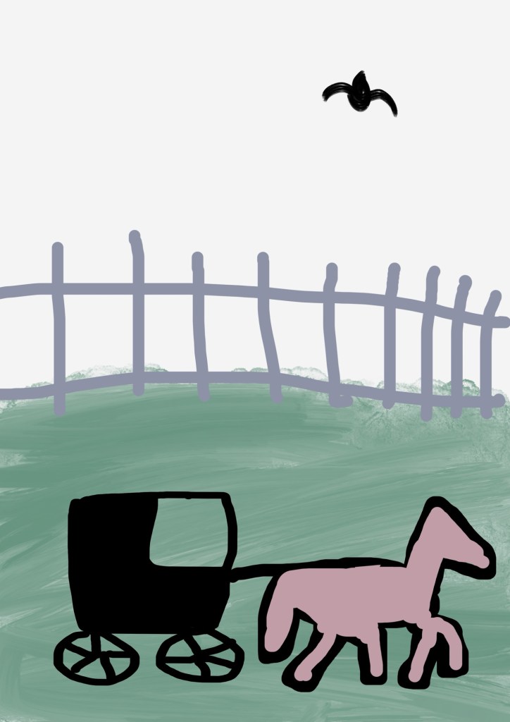 Entry 8. I found some humans. They’re not sitting in metal bins on tracks or cars. Pulled by horses. I followed them to their houses. They are wooden with no feeders in the back. Some of the smaller humans throw seeds. 🕊️